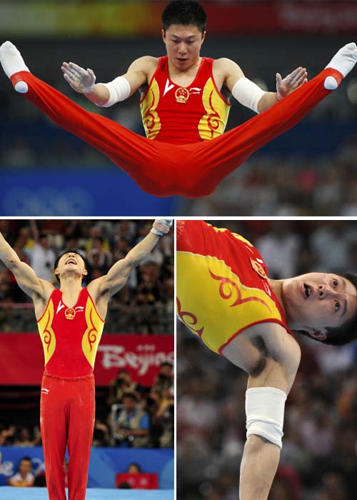 The combo shows Li Xiaopeng, member of the Chinese men's gymnastics team performs his routines during the men's team artistic gymnastics qualifications and finals at the Beijing 2008 Olympic Games August 12, 2008. China won the gold at the final. [Agencies]