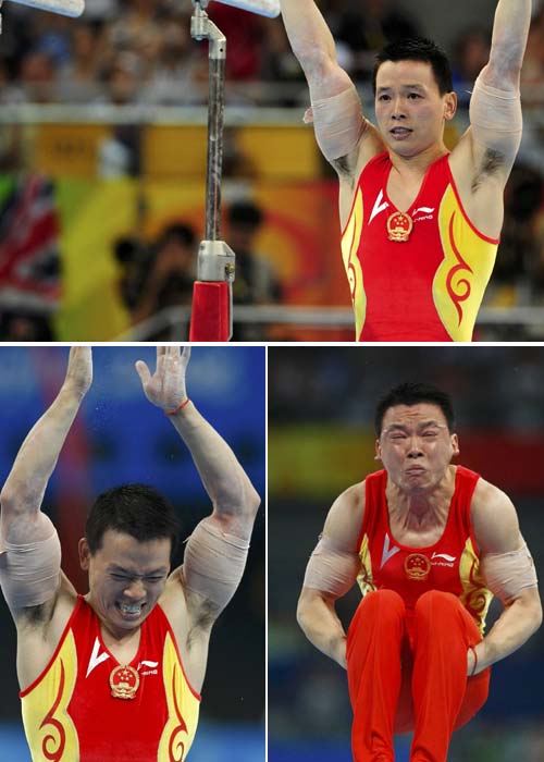 The combo shows Huang Xu, member of the Chinese men's gymnastics team performs his routines during the men's team artistic gymnastics qualifications and finals at the Beijing 2008 Olympic Games August 12, 2008. China won the gold at the final. [Agencies]