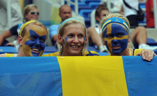 Swedish fans wait for the start of the first round group E women's football match between Sweden and Argentina on August 9, 2008.[Agencies]