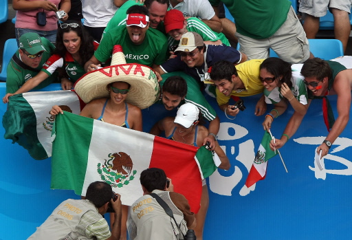 Mexico's Bibiana Candelas with teammate Mayra Garcia (C) pose with supporters after winning against Greece in their women's preliminary beach volleyball match at the 2008 Beijing Olympic Games on August 12, 2008.[Agencies]