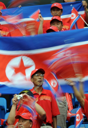 North Korean fans cheer their team before the start of their 2008 Beijing Olympic Games football match against Germany of the women's first round group F match at the Tianjin Olympic stadium on August 12, 2008.[Agencies]