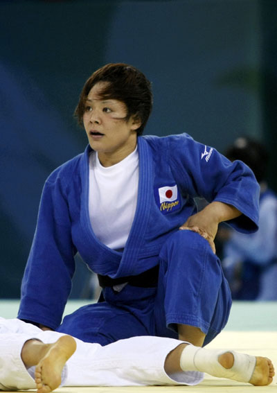 Ayumi Tanimoto of Japan reacts after defeating Kong Jayoung of South Korea during their women's -63kg preliminary judo match at the Beijing 2008 Olympic Games, August 12, 2008.[Agencies]