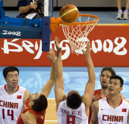China's Zhu Fangyu (C) scores as Spanish Felipe Reyes (2nd L) tries to block him during their preliminary round group B basketball match of the 2008 Beijing Olympic Games on August 12, 2008 at the Olympic Basketball Arena in Beijing. [Agencies]
