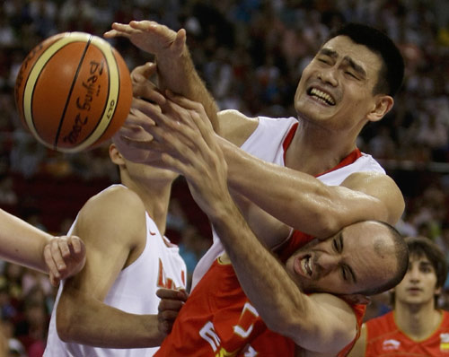 Yao Ming of China (top) and Carlos Jimenez of Spain battle for a rebound during a Group B men's basketball game at the Beijing 2008 Olympic Games August 12, 2008. [Agencies]