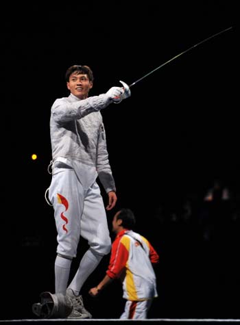 China's Zhong Man celebrates after winning the men's individual sabre final match over France's Nicolas Lopez (unseen) on August 12, 2008 at the Fencing Hall of National Convention Center at the 2008 Beijing Olympic Games. Zhong, 25, gave China their second Olympic fencing title, 24 years after Luan Jujie won the foil in Los Angeles in 1984. [Agencies]