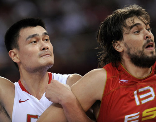 China's Yao Ming (L) and Spain's Marc Gasol fight for a ball during their preliminary round group B basketball match of the 2008 Beijing Olympic Games on August 12, 2008 at the Olympic Basketball Arena in Beijing. [Agencies]
