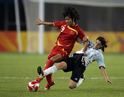 Han Duan (L) of China and Quinones Maria of Argentina fight for the ball during their women's first round Group E soccer match at the Beijing 2008 Olympic Games in Qinhuangdao August 12, 2008. [Agencies]