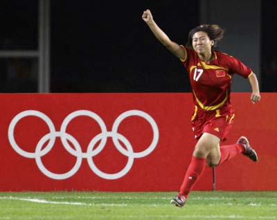 Gu Yasha of China celebrates after scoring during their women's first round Group E soccer match against Argentina at the Beijing 2008 Olympic Games in Qinhuangdao August 12, 2008. [Agencies]