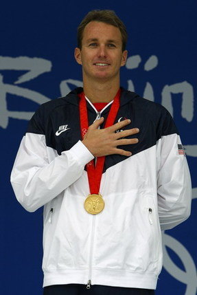 Aaron Peirsol of the US wears his gold medal after winning the men's 100 meters backstroke swimming final during the Beijing 2008 Olympic Games August 12, 2008. [Agencies]