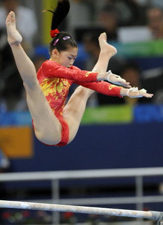 China's Jiang Yuyuan competes on the uneven bars during the women's team final of the artistic gymnastics event of the Beijing 2008 Olympic Games in Beijing on August 13, 2008. China has its first Olympic gold medal in women's gymnastics. [Agencies]