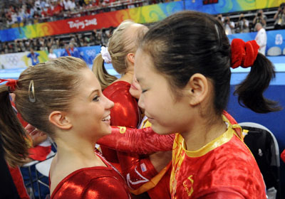 United States' Shawn Johnson (L) and China's Cheng Fei (R) congratulate each other after the women's team final of the artistic gymnastics event of the Beijing 2008 Olympic Games in Beijing on August 13, 2008. China won the gold, while United States won the silver and Romania the bronze.[Agencies]
