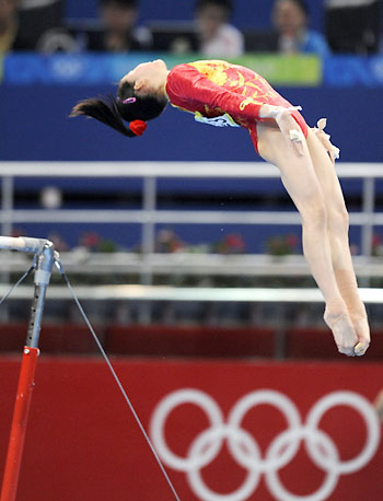 China's Jiang Yuyuan competes on the uneven bars during the women's team final of the artistic gymnastics event of the Beijing 2008 Olympic Games in Beijing on August 13, 2008. China won its first Olympic gold medal in women's gymnastics. [Agencies]