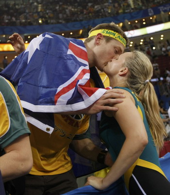Australia's Jenni Screen (R) kisses Neil Mottram, brother of Australian runner Craig Mottram, after the women's basketball Preliminary Round Group A Game 1 between Belarus and Australia at the Beijing 2008 Olympic Games August 9, 2008. [Agencies]
