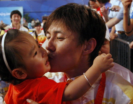 Zhong Man of China kisses a girl as he celebrates his victory against Nicolas Lopez of France after their men's individual sabre fencing final at the Beijing 2008 Olympic Games, August 12, 2008. [Agencies]