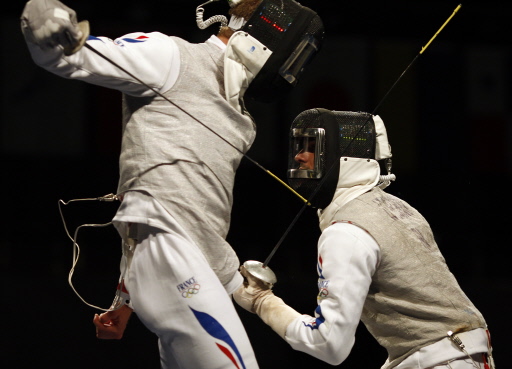 France's Brice Guyart (L) competes against fellow countryman Erwann le Pechoux during the men's individual Foil round of 16 match on August 13, 2008 at the Fencing Hall of National Convention center, as part of the 2008 Beijing Olympic games. Le Pechoux won 15-10.[Agencies]