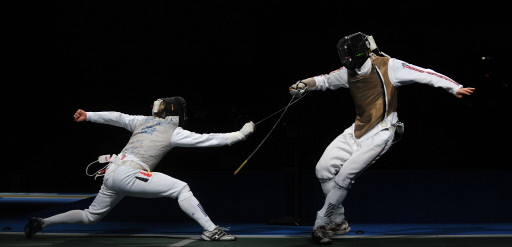 Germany's Peter Joppich (L) competes against Britain's Richard Kruse during the men's individual Foil round of 16 match on August 13, 2008 at the Fencing Hall of National Convention center, as part of the 2008 Beijing Olympic games. Joppich won 10-9.[Agencies]