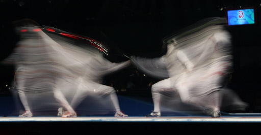 Multiple-exposure photo shows China's Lei Sheng (L) competing against Poland's Slawomir Mocek during the men's individual Foil round of 16 match on August 13, 2008 at the Fencing Hall of National Convention center, as part of the 2008 Beijing Olympic games.[Agencies]