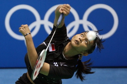 Indonesia's Maria Kristina Yulianti returns a shot to India's Saina Nehwal during their women's singles quarter-final badminton match for the 2008 Beijing Olympic Games at the Beijing University of Technology Gymnasium on August 13, 2008. [Agencies]
