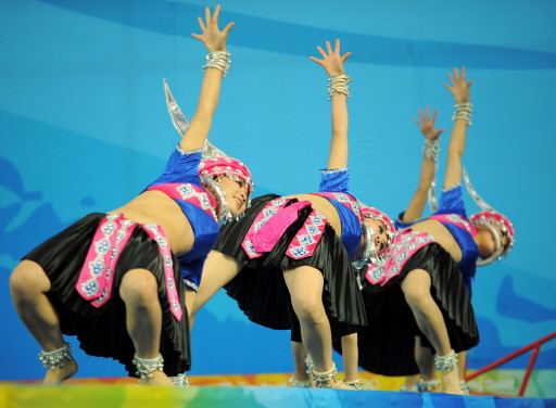 Chinese cheerleaders perform before the men's 69 kg weightlifting event during the 2008 Beijing Olympic Games at the Beijing University of Aeronautics and Astronautics Gymnasium in Beijing on August 12, 2008.[Agencies]