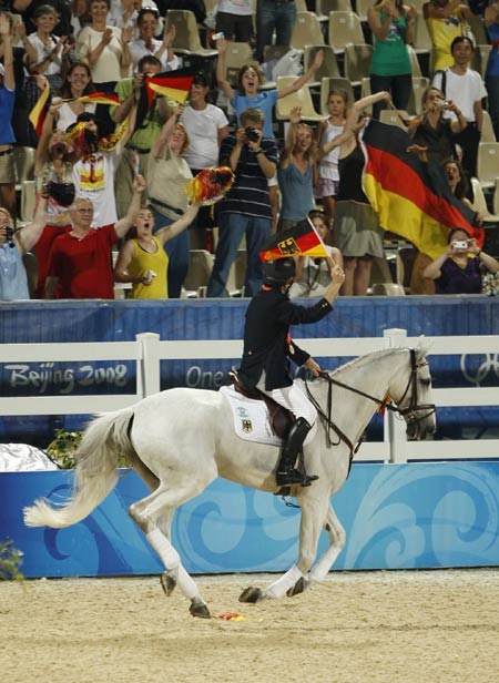 Supporters cheer as Hinrich Romeike of Germany riding Marius celebrates with his gold medal during medal presentation for the equestrian eventing individual final at the Beijing 2008 Olympic Games in Hong Kong August 13, 2008. [Reuters]