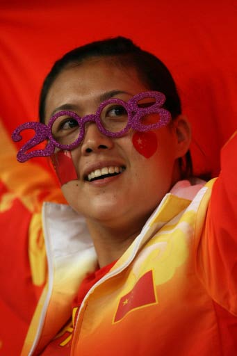 A Chinese supporter holds her national flag as she attends the men's individual Foil tournament on August 12, 2008 at the Fencing Hall of National Convention center, as part of the 2008 Beijing Olympic games, Beijing, China. [AFP]