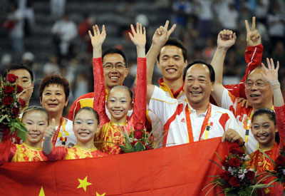 The Chinese team celebrates after winning the gold in the women's team final of the artistic gymnastics event of the Beijing 2008 Olympic Games in Beijing on August 13, 2008. China won the gold, while United States won the silver and Romania the bronze.[Agencies]