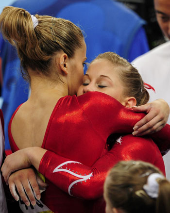 Shawn Johnson of the U.S. (R) consoles teammate Alicia Sacramone after the final results in the women's team artistic gymnastics final at the Beijing 2008 Olympic Games August 13, 2008.[Agencies]