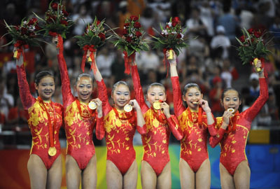The Chinese team celebrates on the podium after winning the gold in the women's team final of the artistic gymnastics event of the Beijing 2008 Olympic Games in Beijing on August 13, 2008. China won the gold, while United States won the silver and Romania the bronze.[Agencies]