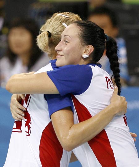 Liudmila Postnova (R) and Irina Bliznova of Russia embrace as they celebrate their win over Brazil in their women's preliminary Group B handball game at the Beijing 2008 Olympic Games August 13, 2008.[AFP]