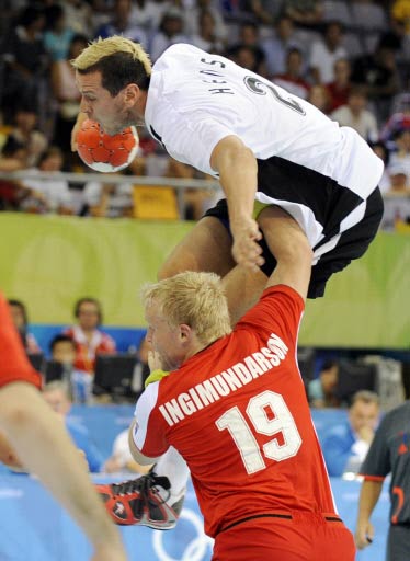 German Pascal Hens (up) vies with Iceland's Ingimundur Ingimundarson during their 2008 Beijing Olympic Games men's group B preliminary handball match in Beijing on August 12, 2008. Iceland beat Germany 33-29.[AFP]
