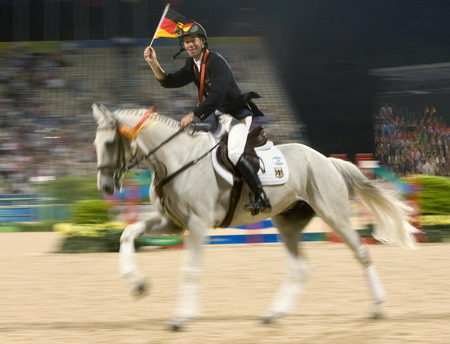 Gold medallist Hinrich Romeike of Germany takes a victory lap during the awards ceremony of the equestrian eventing competition at the Beijing 2008 Olympic Games in Hong Kong August 13, 2008. [Agencies]