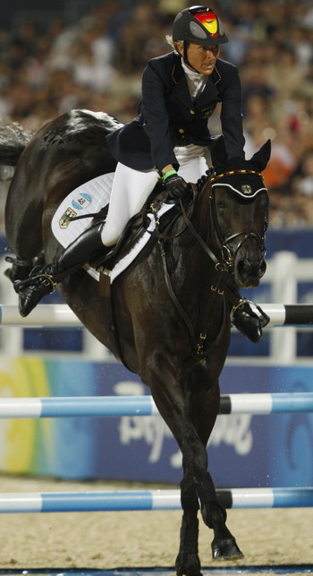 Ingrid Klimke of Germany rides Abraxxas during the equestrian eventing show jumping competition at the Beijing 2008 Olympic Games in Hong Kong August 12, 2008. [Agencies]
