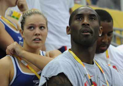 US basketball player Kobe Bryant watches the swimming finals in the spectator stands at the National Aquatics Center during the Beijing 2008 Olympic Games in Beijing on August 13,2008. [Agencies]
