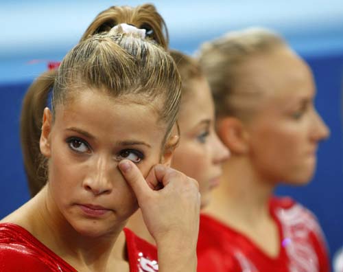 Alicia Sacramone of the US (L) with teammates Shawn Johnson (C) and Nastia Liukin watch a routine on the floor exercise in the women's team artistic gymnastics final at the Beijing 2008 Olympic Games August 13, 2008.[Agencies]