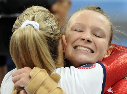 United States' Bridget Sloan hugs a teammate after competing on the vault during the women's team final of the artistic gymnastics event of the Beijing 2008 Olympic Games in Beijing on August 13, 2008.[Agencies]