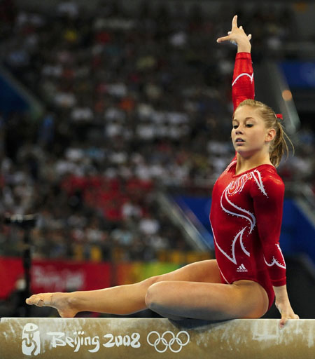 Shawn Johnson of the US competes on the balance beam in the women's team artistic gymnastics final at the Beijing 2008 Olympic Games August 13, 2008.[Agencies]