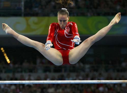 Chellsie Memmel of the US competes on the uneven bars in the women's team artistic gymnastics final at the Beijing 2008 Olympic Games August 13, 2008.[Agencies]