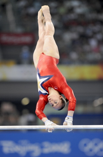 United States' Chellsie Memmel competes on the uneven bars during the women's qualification of the artistic gymnastics event of the Beijing 2008 Olympic Games in Beijing on August 10, 2008.[Agencies]