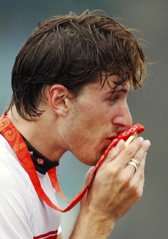 Fabian Cancellara of Switzerland kisses his gold medal after winning the men's time trial cycling competition during the Beijing 2008 Olympic Games August 13, 2008. [Agencies]