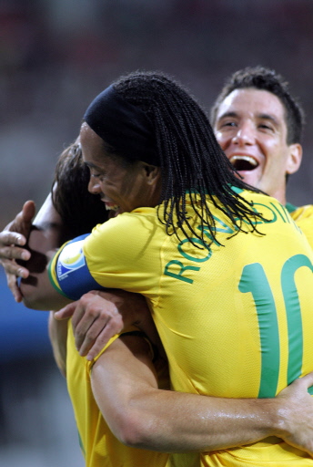 Brazil's first goal came in the 18th minute when Alves Diego ran after a through pass by Ronaldinho, and avoided Chinese goalkeeper Liu Zhenli on their one-on-one encounter before he coolly sent the ball into the empty net.