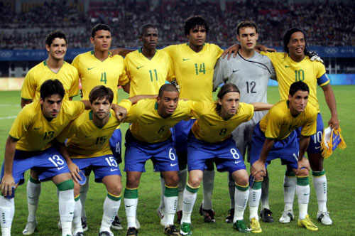 Brazil's team members pose prior to the 2008 Beijing Olympic Games first round Group C men's football match against China at the Qinghuangdao Olympic Stadium on August 13, 2008.[Agencies]