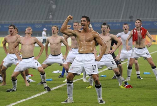 New Zealand players perform the "haka" after their 2008 Beijing Olympic Games first round Group C men's football match against Belgium at the Shanghai Stadium on August 13, 2008. Belgium defeated New Zealand 1-0. [Agencies]
