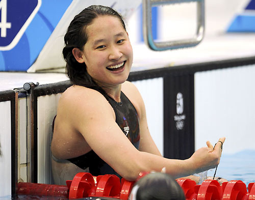 Liu Zige of China celebrates winning the women's 200 meters butterfly swimming final at the National Aquatics Center during the Beijing 2008 Olympic Games August 14, 2008. Liu smashed Australian Jessicah Schipper's world record in the women's 200m butterfly Thursday, pocketing host China's first swimming gold at the Beijing Olympic Games.[Agencies]
