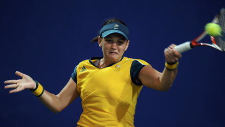 Casey Dellacqua of Australia hits a return against Gisela Dulko of Argentina during their first round tennis match at the Beijing 2008 Olympic Games, August 11, 2008. [Agencies]
