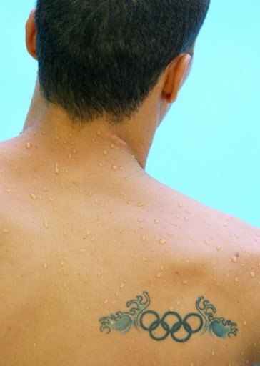 A tattoo of the Olympic rings is seen on the back of an unidentified diver during practice at the National Aquatics Center, which is also known as the Water Cube, in preperation for the 2008 Beijing Olympic Games in Beijing on August 5, 2008. [Agencies]
