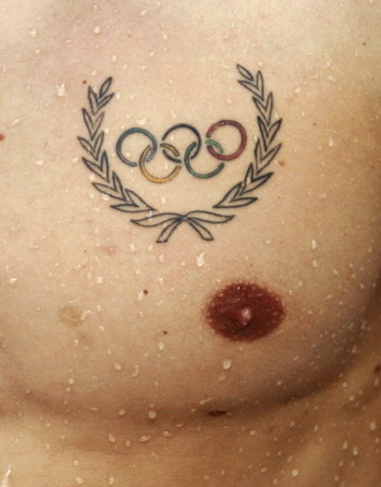 The Olympic logo is tattooed on the chest of a swimmer at the National Aquatics Centre, also known as the Water Cube, ahead of the Beijing 2008 Olympic Games August 7, 2008. [Agencies]