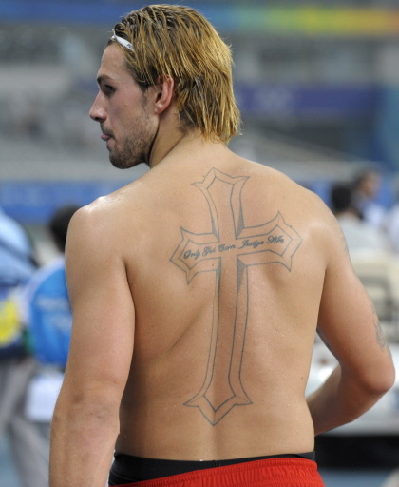Belgium's goalkeeper Logan Bailly displays the tattoo on his back after their 2008 Beijing Olympic Games first round Group C men's football match against New Zealand at the Shanghai Stadium on August 13, 2008.[Agencies]