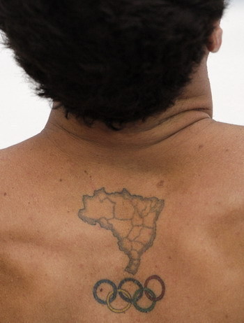 A tattoo in the shape of Brazil is seen in the back of Hugo Parisi of Brazil during his 10m diving platform practice session for the Beijing 2008 Olympic Games August 4, 2008. [Agencies]