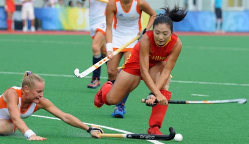 Melo Fatima De Moreira (L) of the Netherlands stops a shot by Li Hongxia (R) of China during their 2008 Beijing Olympic Games women's field hockey match in Beijing on August 14, 2008. China lost to the Netherlands 0:1 in the competition. [Agencies]