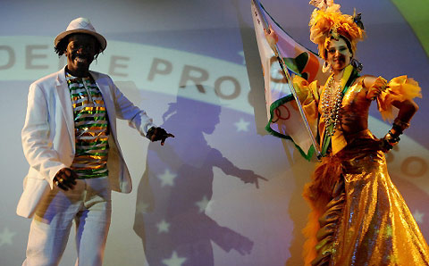 A Brazillian samba dancer holds the official flag for the city of Rio de Janeiro which will bid for the 2016 Olympic Games, at a promotional event in Beijing on August 13, 2008.[Agencies]